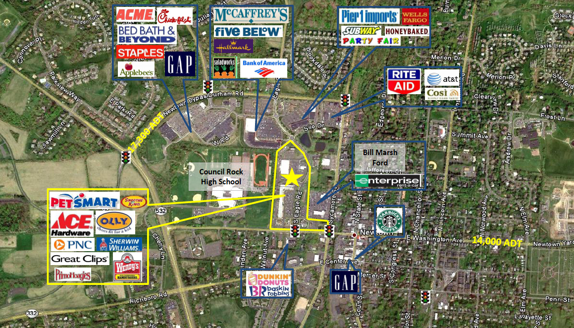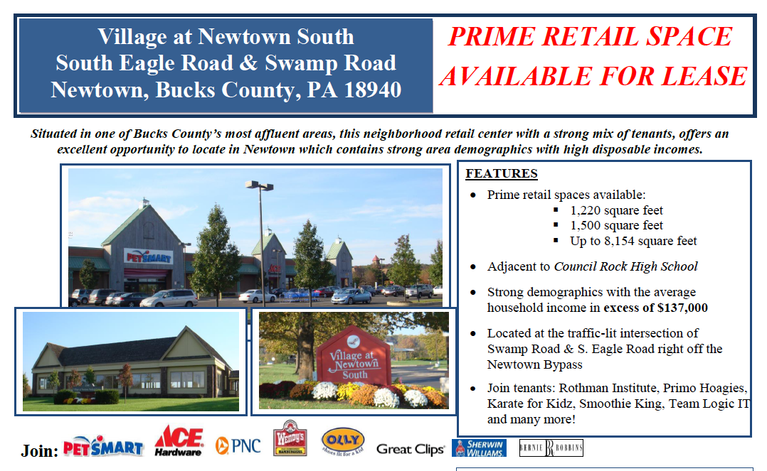 Petsmart, Ace Hardware, Newtown Farmer’s Market, Sleepy’s, Rothman Institute